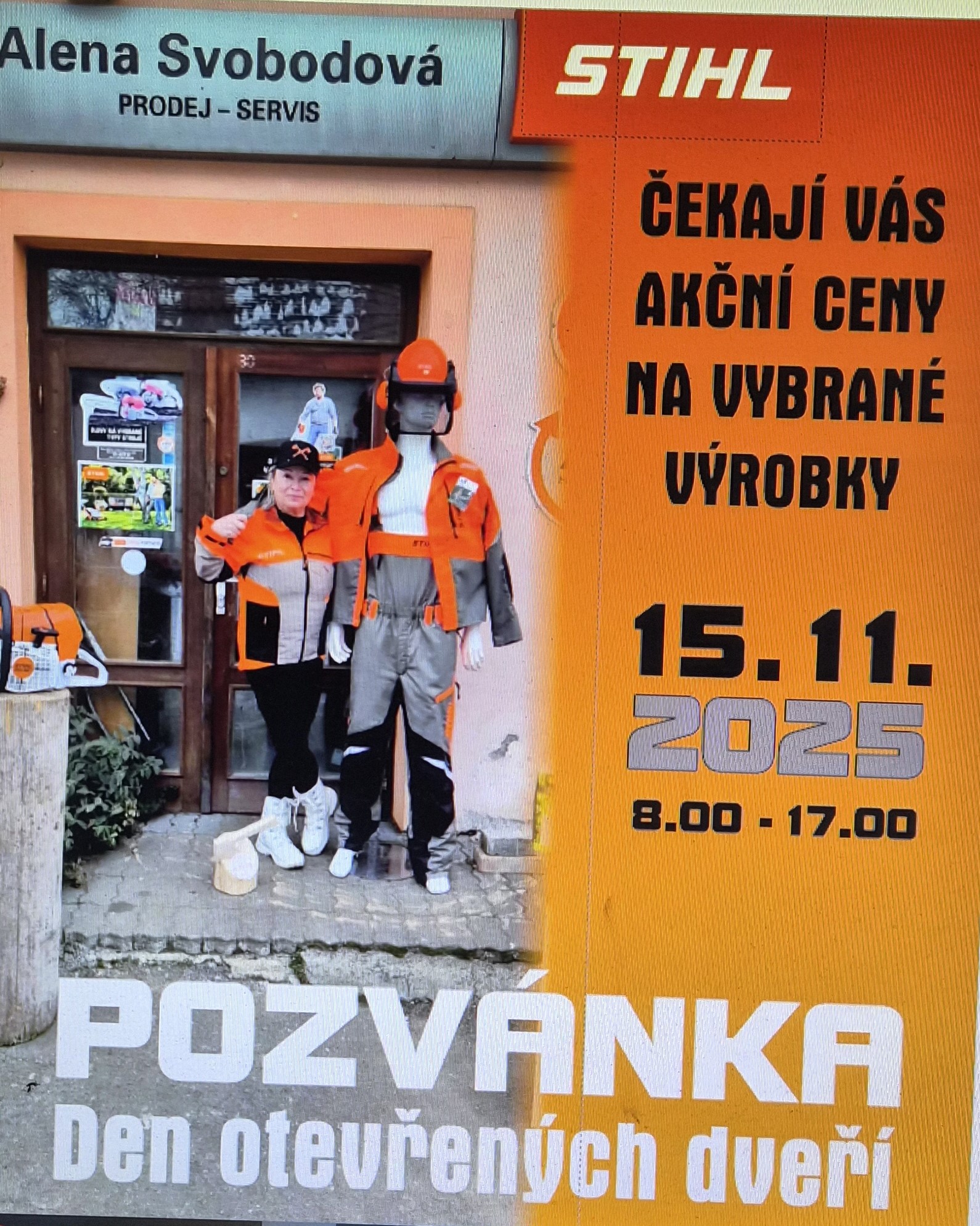 Čekají Vás akční ceny na vybrané výrobky, možnost vyzkoušet si stroje akumulátorové techniky výrobků Stihl a samozřejmě pohoštění. Těšíme se na Vás od 8.00 do 17,00 hod.