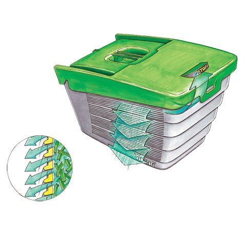 Díky dolů směřujícím odvětrávacím otvorům a uzavřenému víku sběrného koše nemůže posečená tráva a prach unikat směrem nahoru. Nářadí se méně znečisťuje. Integrovaný indikátor stavu naplnění informuje o správném okamžiku vyprázdnění. Dvoudílná konstrukce sběrného koše zajišťuje snadné otevírání a vyprazdňování.